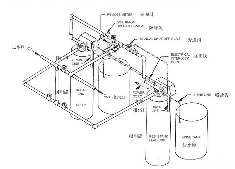 原水在一定的压力(0.2-0.6Mpa)、流量下,通过控制器阀腔,进入装有离子交换树脂的容器(树脂罐),树脂中所含的Na+与水中的阳离子(Ca2+,Mg2+,Fe2+……等)进行交换,使容器出水的Ca2+,Mg2+离子含量达到既定的要求,实现了硬水的软化。